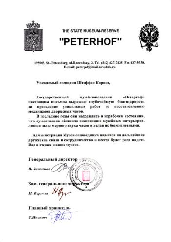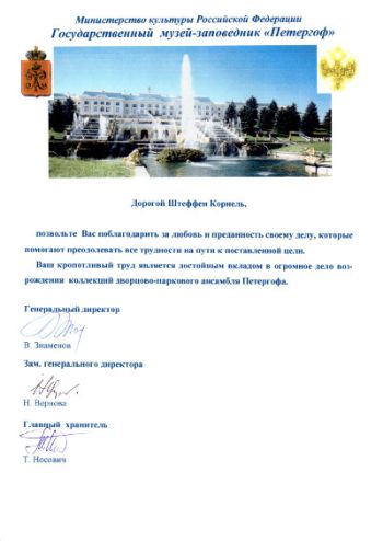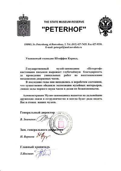 das staatliche Museum „Peterhof“ drückt mit diesem Brief seine Dankbarkeit für die Durchführung einzigartiger Restaurierungsarbeiten an den Uhrwerken des Palastes aus.
